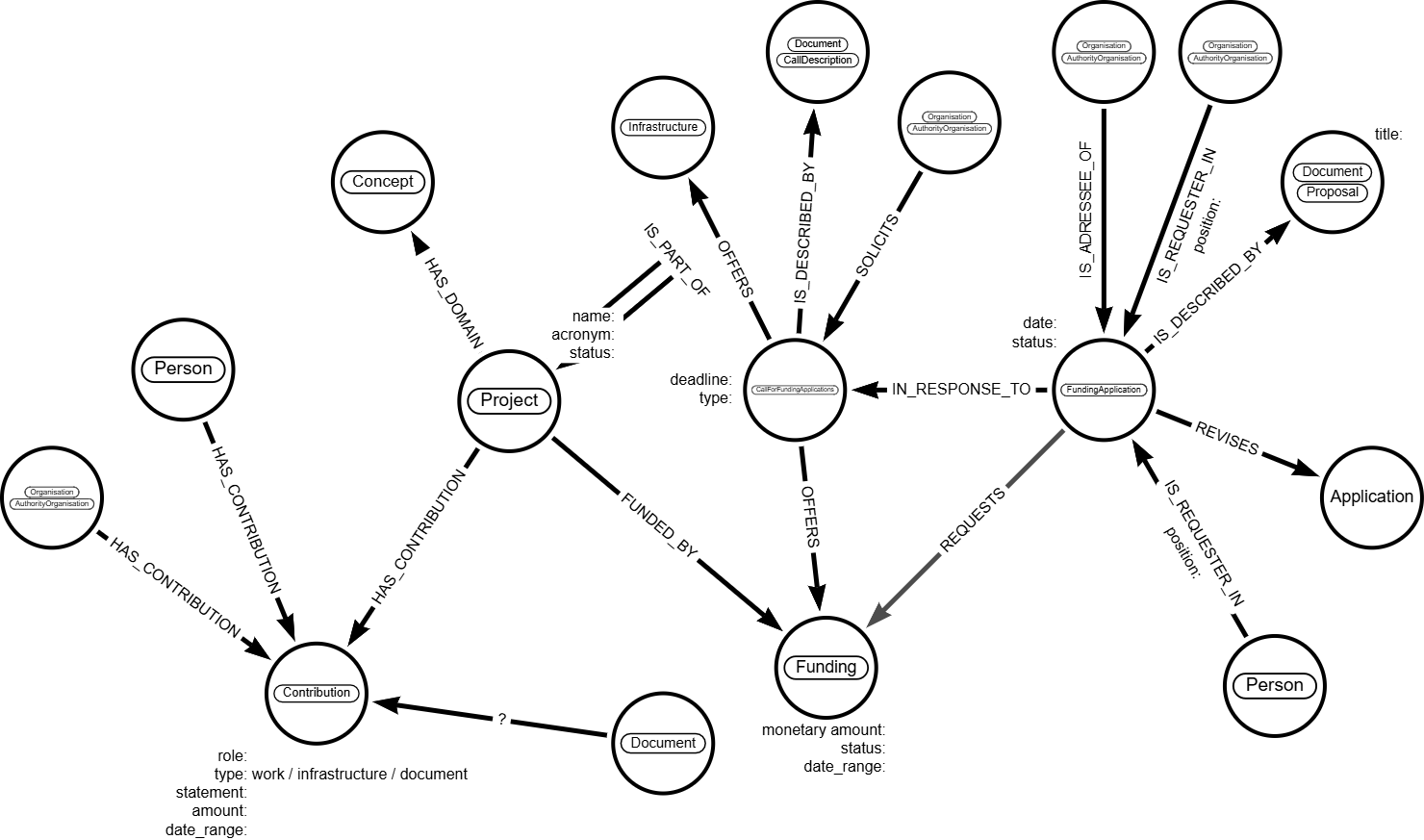 De la même manière que les documents, les projets sont reliés à un nœud Contribution. Une propriété "type" ("work", "infrastructure" ou "document") est introduite sur ce nœud : il s'agit d'une simplification des Contribution Statements CERIF précédemment décrits.