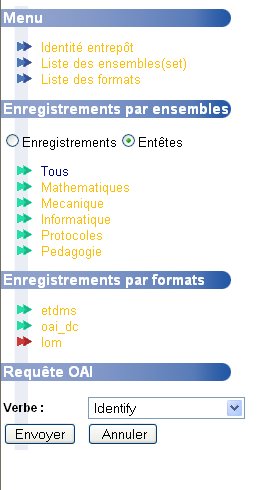 Un menu dynamique apparait sur la gauche, qui liste tous les ensembles et tous les formats exposés par l'entrepôt OAI :