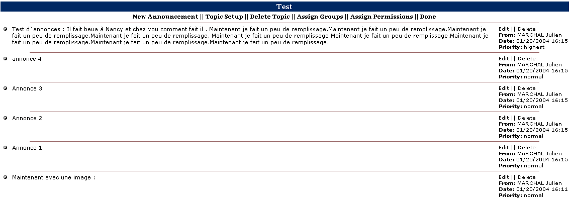 Comme vous pouvez le voir le texte de l'annonce se saisie dans une zonne multi-ligne, mais le rendu ne ce fait pas en multi-ligne, cela vient de la feuille de style (xsl) permettant l'affichage (cela se résoud facilement : fait à nancy)