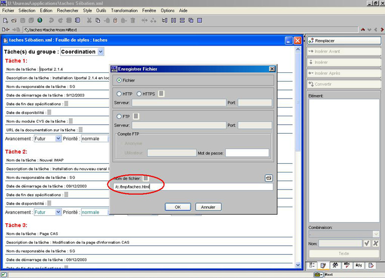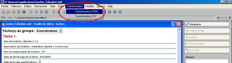 Quand le fichier taches.xml est ouvert dans XXE utiliser le menu "Transformation->Transformation