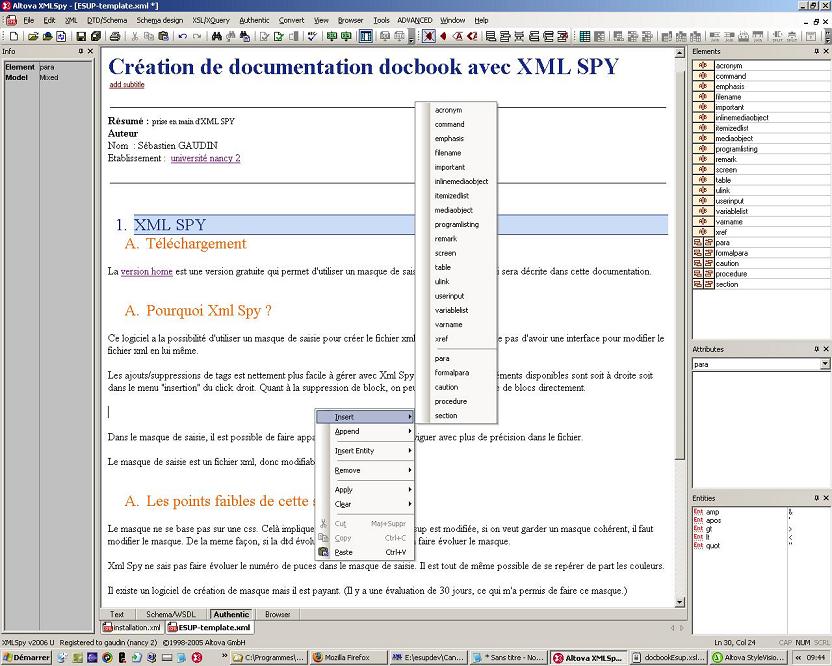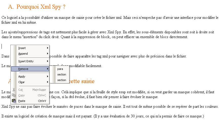 Xml Spy permet de d'utiliser non seulement la dtd en ligne pour vérifier la saisie, mais aussi la feuille xsl pour avoir le véritable rendu html en 1 click. Ce rendu est bien sûr enregistrable d'où une extrème facilité pour créer les pages de documentation.
