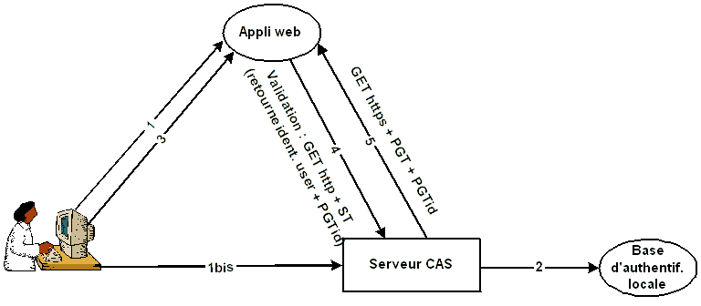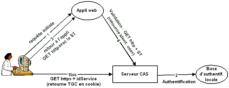En paramètre du GET est passé l'ID du service (c'est en fait l'URL de retour).2. Authentification : le serveur CAS authentifie la personne grâce au mécanisme local d'authentification (LDAP, kerberos, certificat, ...).