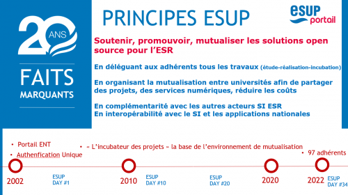 En 2022, ESUP-Portail a fêté ses 20 ans. En 2002 quelques établissements fondateurs ont proposé un projet d'ENT (Espace Numérique de Travail) avec la spécificité de partager une solution open-source.