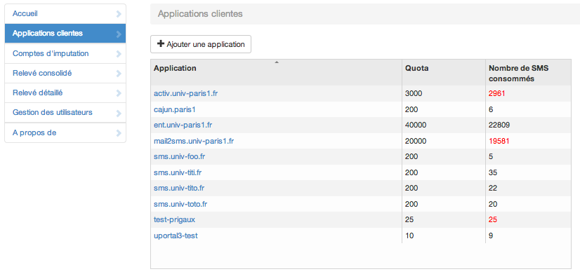 Cliquer sur le menu « Application clientes » puis sur l'icône application à supprimer, puis sur « Supprimer » de l'application à supprimer :