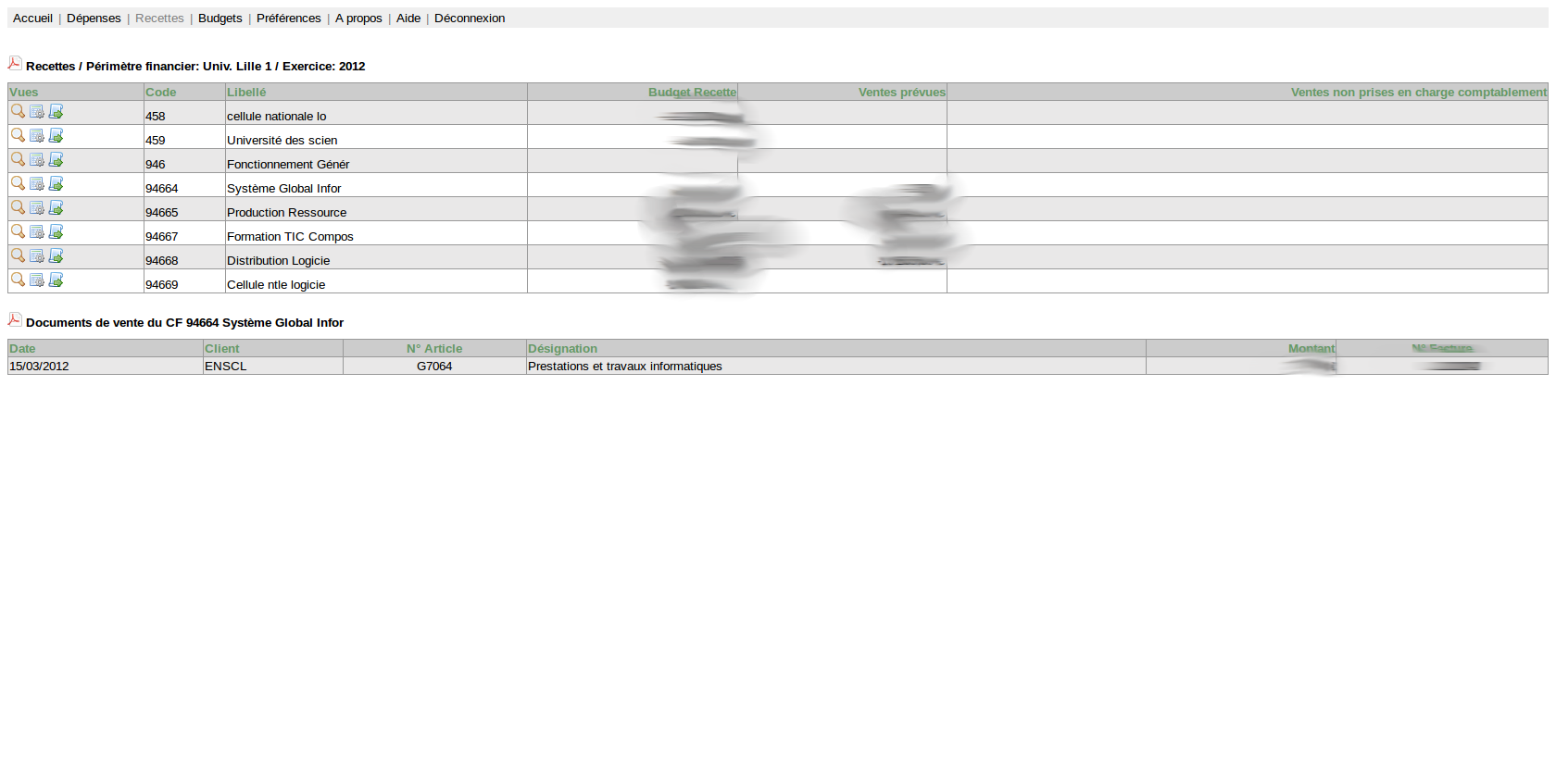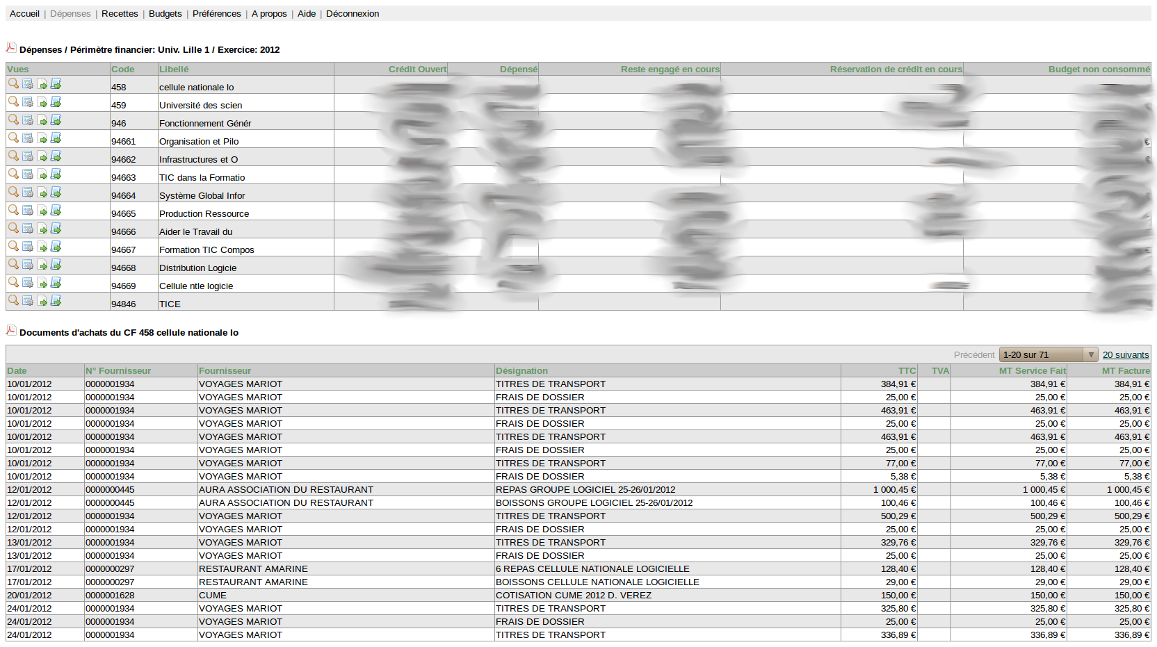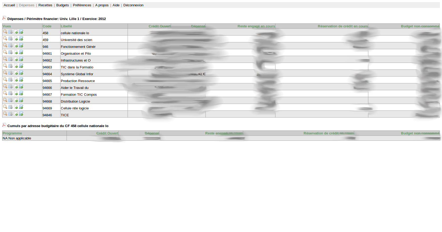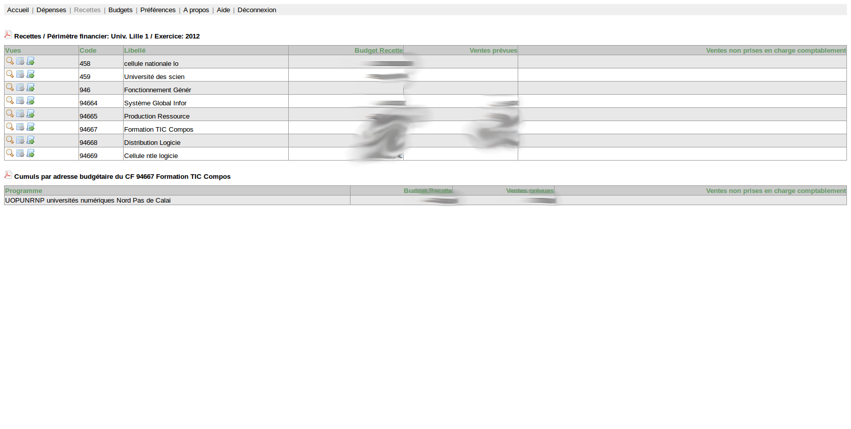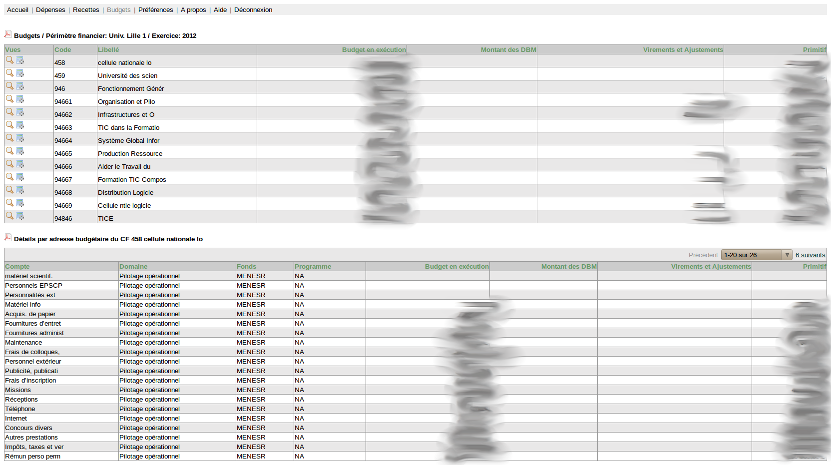- Choisir "Dépenses", "Recettes" ou "Budgets"... Les données présentées à l'utilisateur correspondant aux Centres Financiers pour lesquels il est habilité.