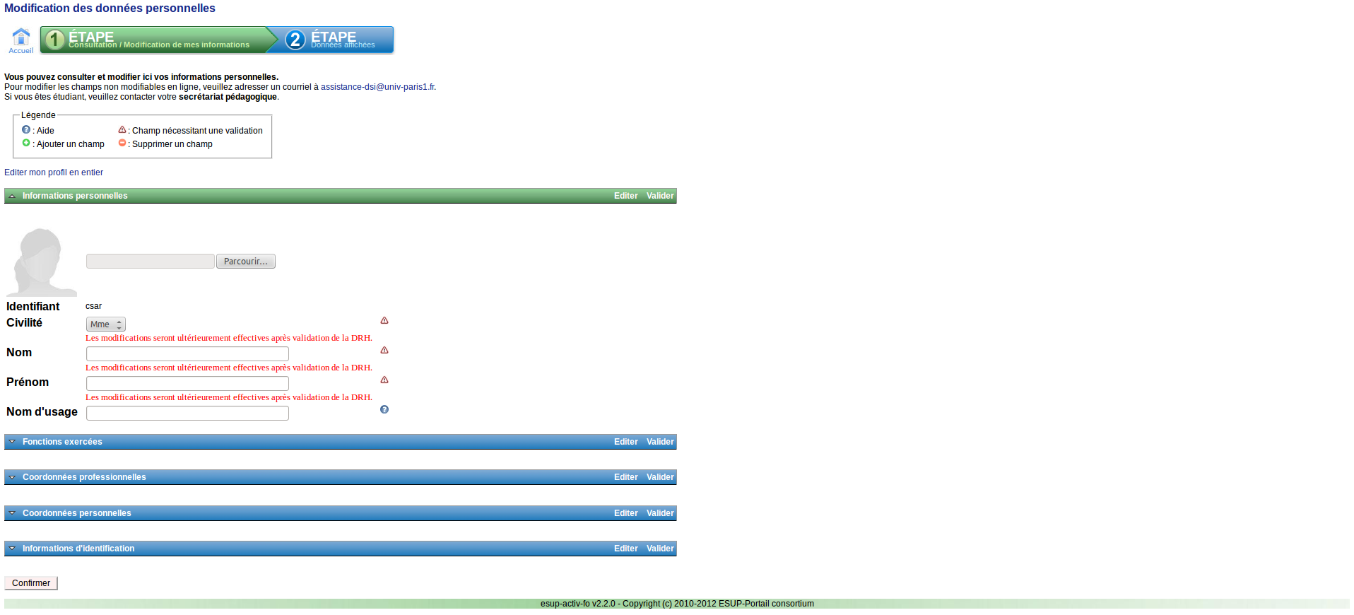 La procédure permet de modifier les données personnelles d'un personnel, d'un étudiant, ou d'un adhérent réseau pro. Certaines informations modifées seront affichées dans les annuaires privés et public de l'université. L'utilisateur peut retourner à tout moment sur la page d'accueil en cliquant sur l’icône