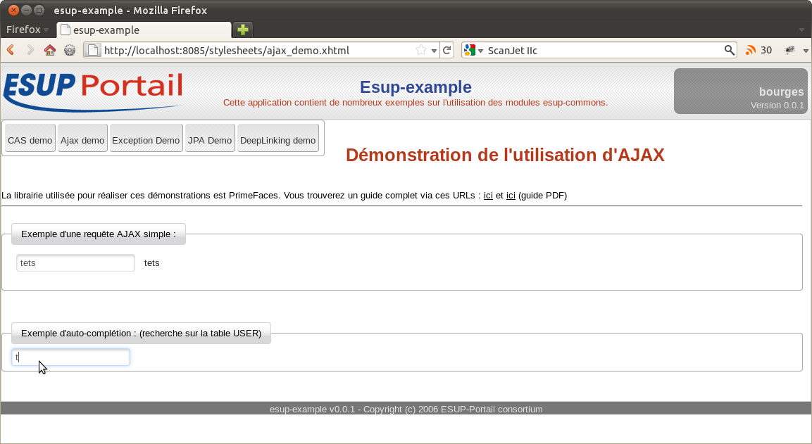 - Ne plus être dépendant d'une seule technologie de vue. ESUP-Commons V1 était très lié à JSF. ESUP-Commons V2 est JSF ou Spring-MVC. A noter que JSF utilise JSF 2.0 en mode servlet et JSF 1.2 en mode portlet (pour des questions de compatibilité avec uPortal < 3.3). Ces nouvelles versions de JSF permettent d'utiliser Facelet et des librairies de composants qui permette de produire rapidement de riches interfaces Ajax