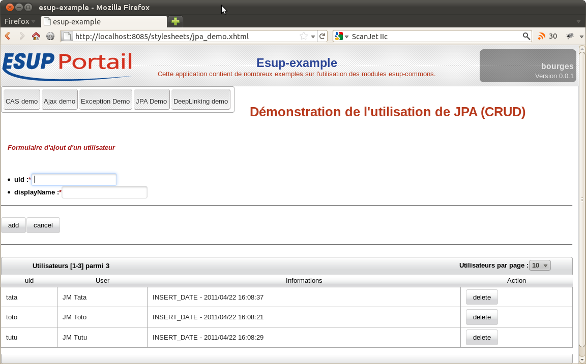 - Les application ESUP-Commons example qui ont un but pédagogique pour servir de support à la formation ou comme référence pour un projet à bâtir