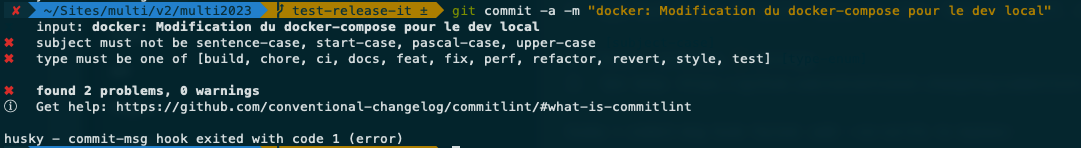 A présent, dès lors que le message de votre commit ne répondra pas au nommage conventionnel, commitlint vous retournera une erreur et le commit ne passera pas.