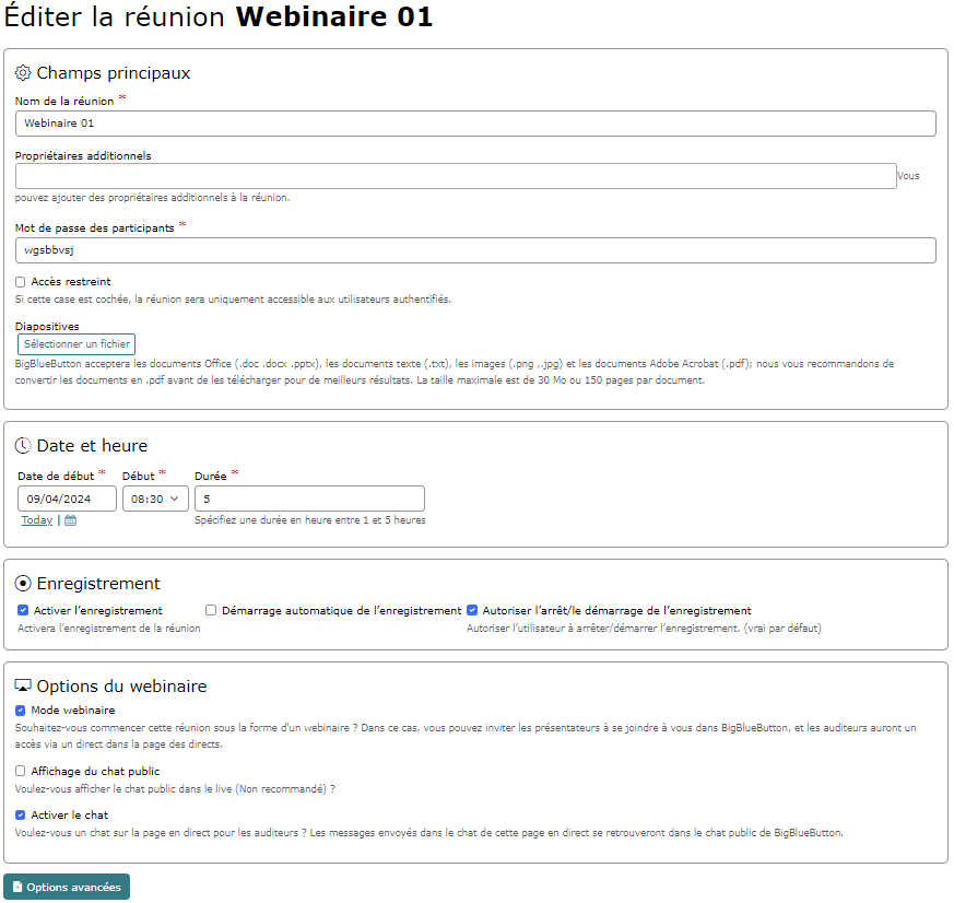 • les présentateurs devront rejoindre la réunion BigBlueButton,
