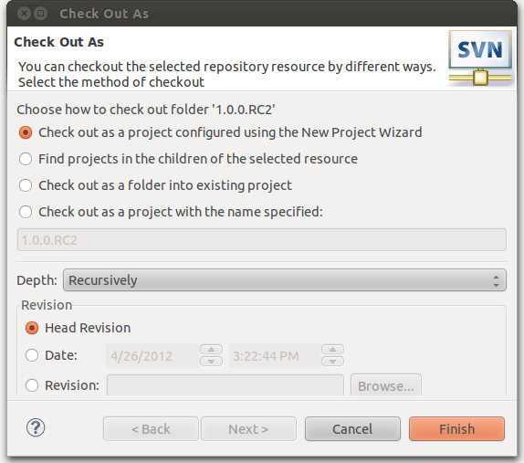 A l'aide du plugin subversion, en perspective SVN Repository Exploring faire un checkout de la dernière version stable d'esup-search-ofm :