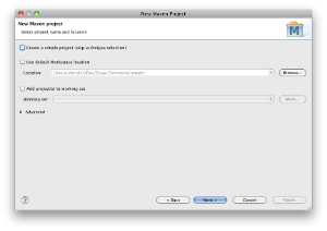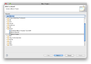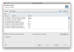Nous avons constaté quelques soucis dans la création de projet à partir d'un archetype avec le plugin maven d'eclipse : m2eclipse. Si vous rencontrez des messages d'erreurs indiquant qu'eclipse ne parvient pas à trouver l'archetype (voir erreur ci-dessous) n'hésitez pas à relancer complètement Eclipe.