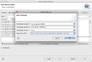 - numeroVersionArchetype : numéro de version de l'archetype à utiliser (version 0.2.8 à l'heure où sont écrites ces lignes). Pour connaître le numéro de version de l'archetype, merci de vous référer à cette page : Changelog