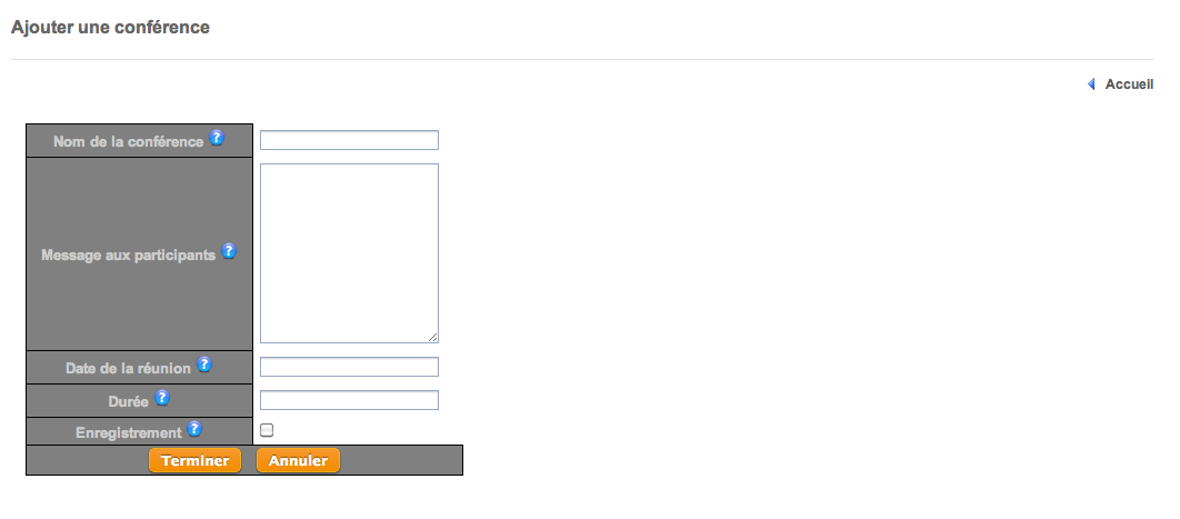 Le lien "Ajouter une conférence" vous permet d'en créer une nouvelle. Vous devez alors remplir les champs :