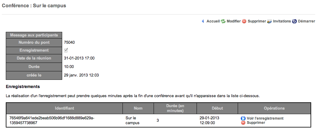 Sous réserve d'en avoir demandé la création en cochant la case correspondante, vous pouvez consulter et supprimer les enregistrements de la conférence.