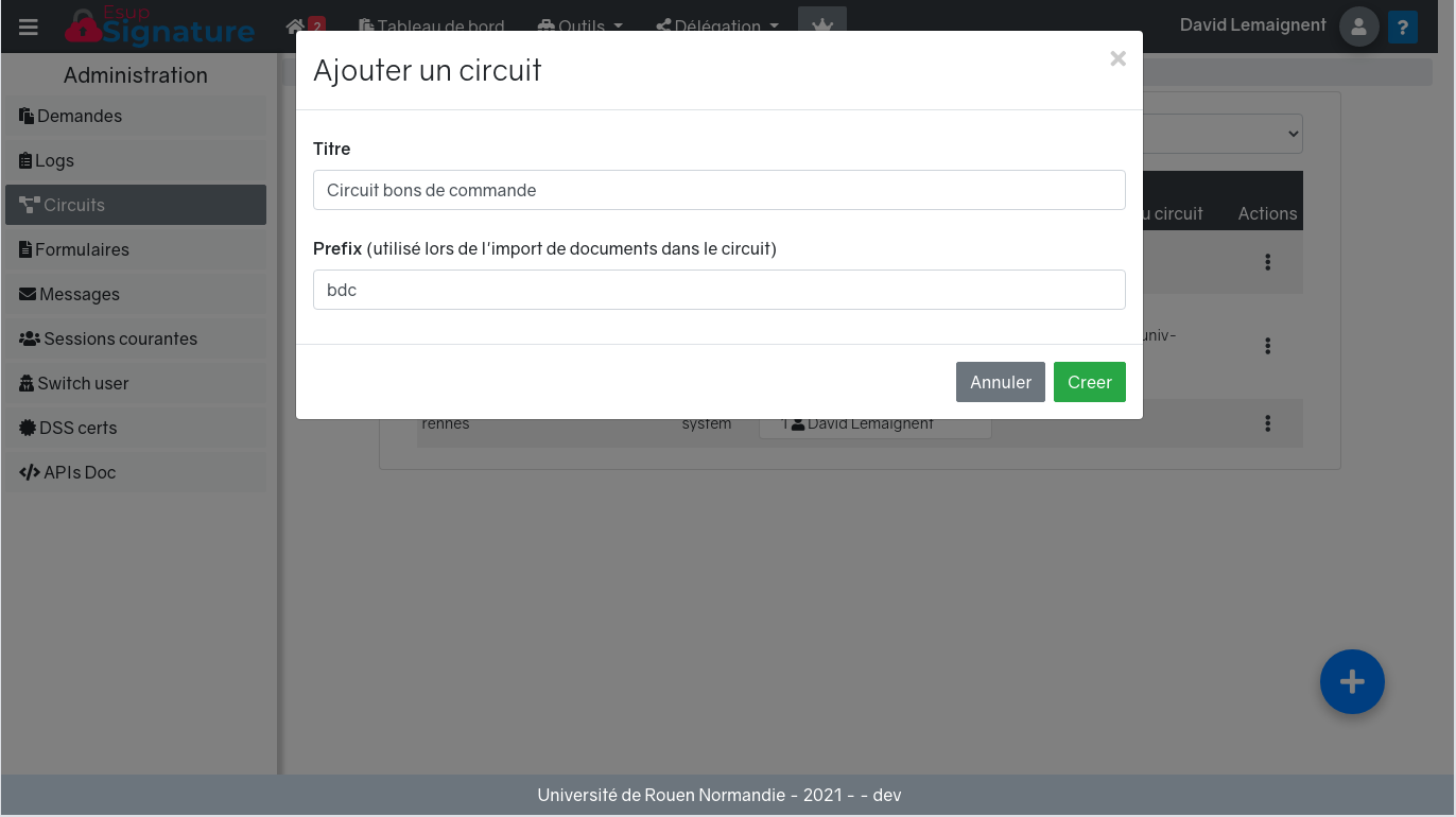 Pour ajouter un nouveau circuit via l'interface graphique, cliquez sur le bouton bleu "+" puis saisissez un nom et un préfixe (utilisé pour le nommage des documents lors des imports).