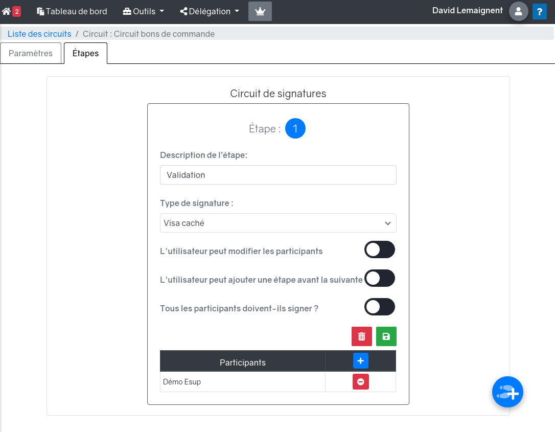 Esup-signature permet de créer des circuits de signatures puissants dont les paramètres pour chaque l'étape sont :