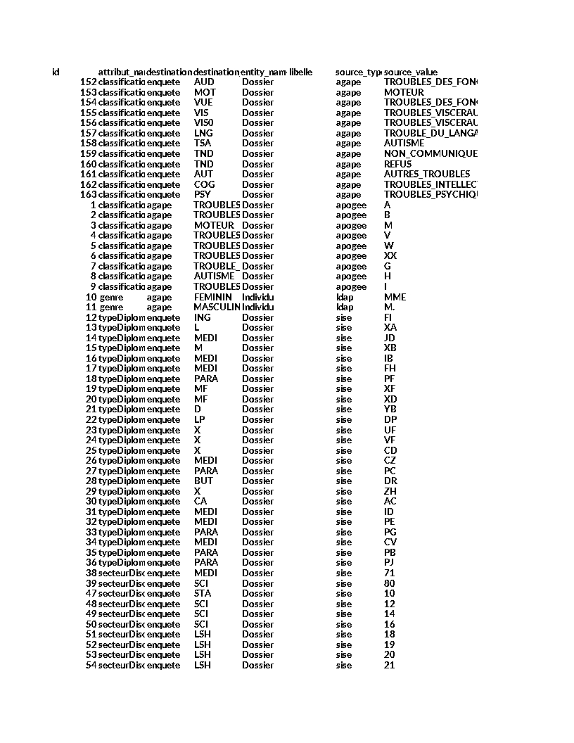 Les tables de correspondances apogee, sise, ldap doivent être renseignées dans la table postgresql "DataMapping". Voici un premier jeu de données issues de l'instance de l'université de Rouen :