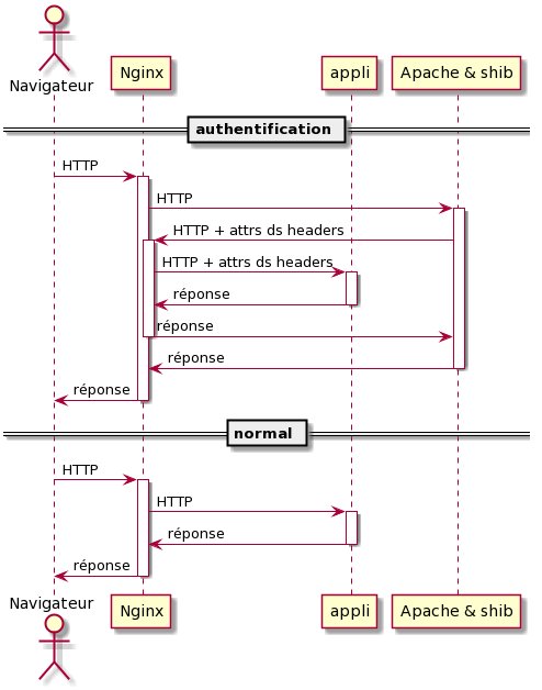 (diagrammes de séquences réalisés avec plantuml et les fichiers apache-shib-simple.puml et nginx-shib-proxy.puml)