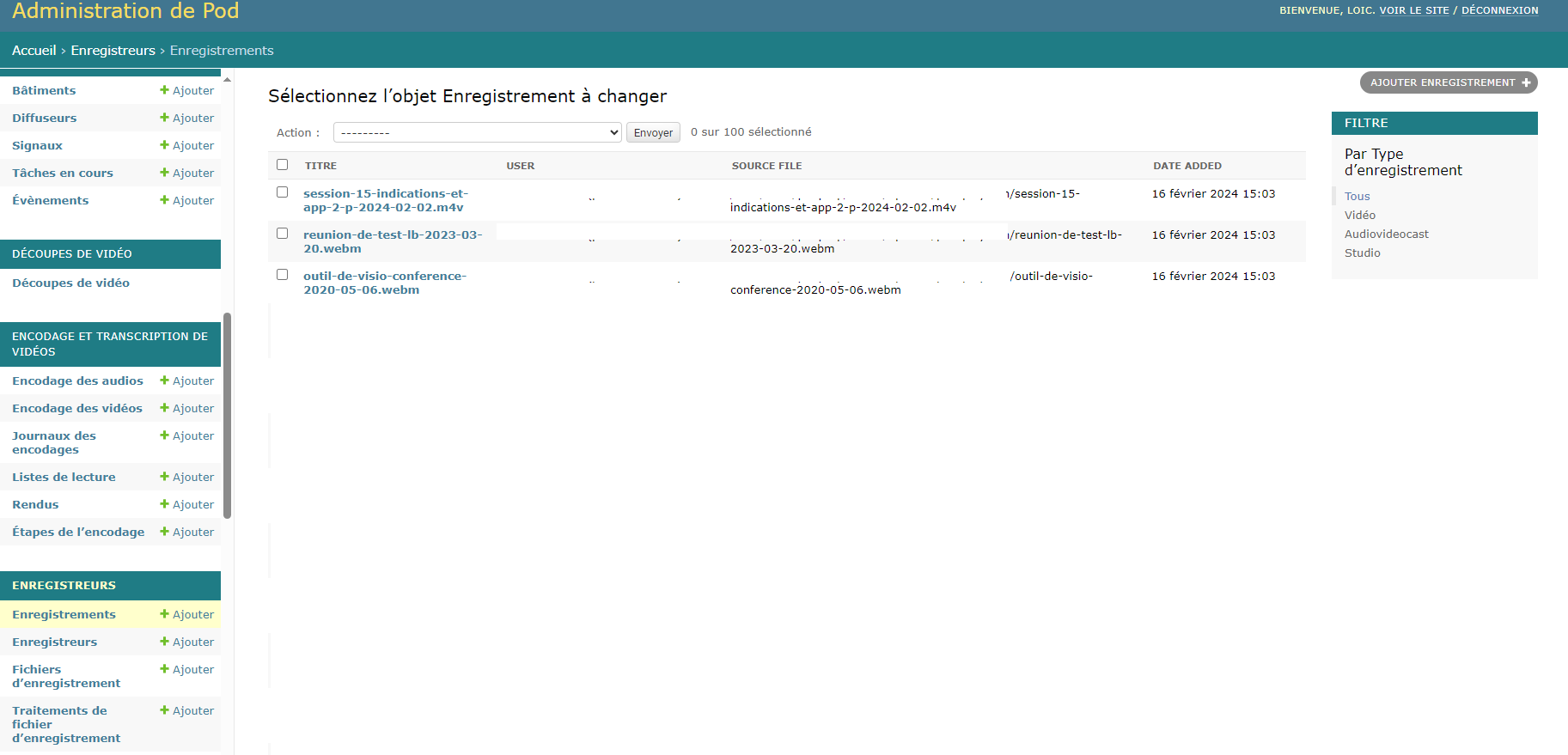 Ils pourront alors par eux-mêmes importer ces enregistrements dans Pod. Au cas où, si des enregistrements ne sont pas identifiables (par exemple en provenance d'autres sources que Pod ou Moodle), ils seront associés à un administrateur (à paramétrer dans le script).