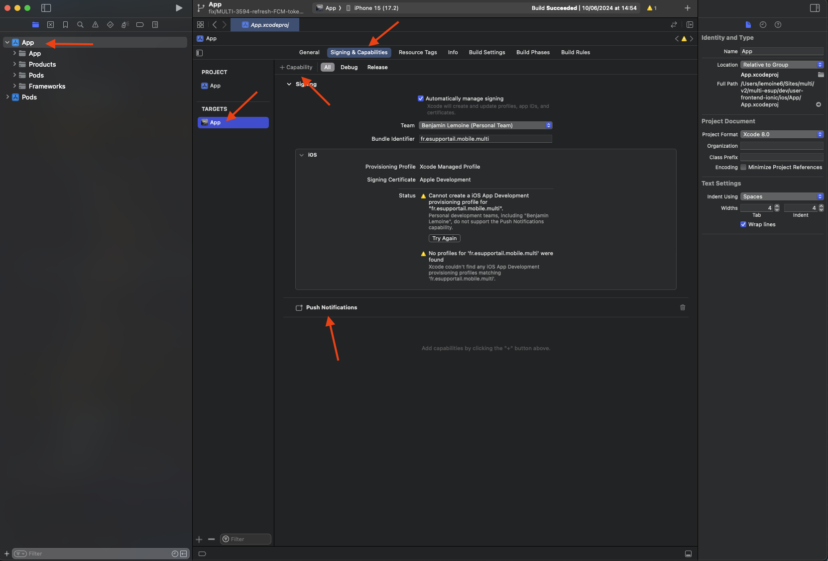 Une fois le projet ouvert dans XCode, il faut configurer le projet pour autoriser les notifications.