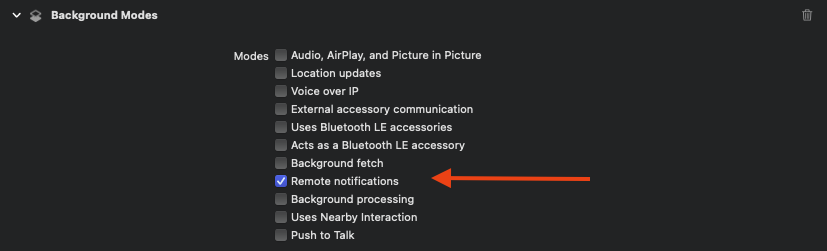 Ajoutez également la capability Background Modes en sélectionnant la case Remote notifications