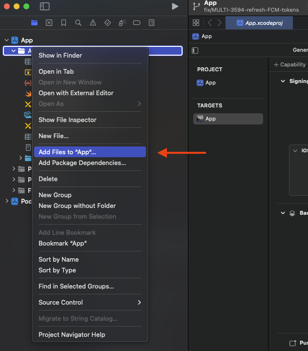 Faites un clic droit sur le dossier App/ dans le menu de gauche et cliquez sur Add Files to "App"... Ajoutez alors le fichier GoogleService-Info.plist
