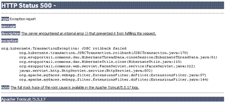 Même dans une application mûre, il n'est de cas pour lesquels une exception ne puisse se produire. esup-commons offre une gestion des exceptions qui évite au développeur de recevoir le message traditionnel de Tomcat :