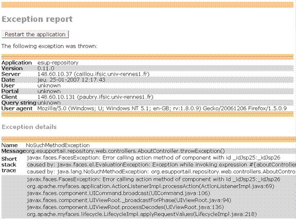 La vue /stylesheets/exception.jsp présente à l'utilisateur un bouton permettant de redémarrer l'application. Ce bouton appelle la méthode restart() du contrôleur exceptionController déclaré dans le fichier de configuration /properties/web/controllers.xml.