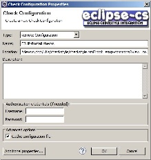 Cliquer sur New pour créer une nouvelle configuration Checkstyle, choisir une configuration distante, indiquer l'URL http://subversion.cru.fr/esup-commons/utils/checkstyle/checkstyle.xml et cacher la configuration pour pouvoir l'utiliser hors ligne :
