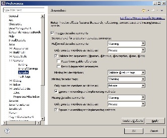 Ouvrir les préférences d'Eclipse puis modifier les options de compilation (menu Window > Preferences > Java > Compiler > Javadoc) :