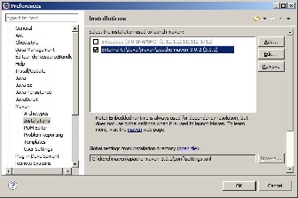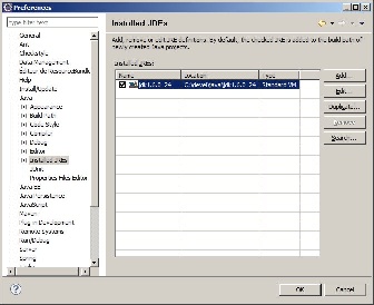 Vérifier que le JDK pointé par Eclipse est bien celui désiré, ce qui est fait automatiquement si la variables JAVA_HOME a bien été positionnée (menu Window > Preferences > Java > Installed JREs) :