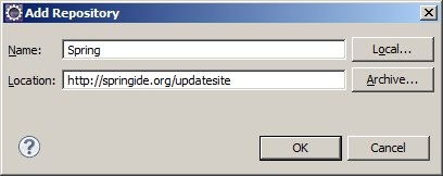 Lancer Eclipse, ouvrir le menu Help > Install New Software > Add... et indiquer le site http://springide.org/updatesite :