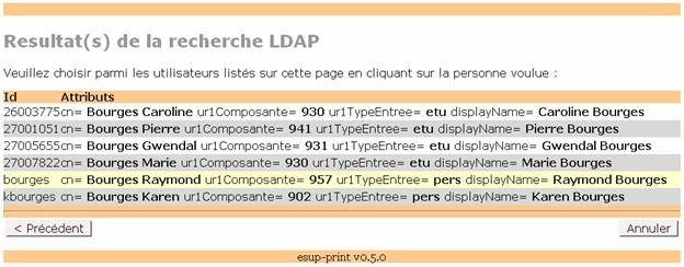 L'appui sur « Suivant » doit afficher la page ldapSearchResults.jsp suivante :
