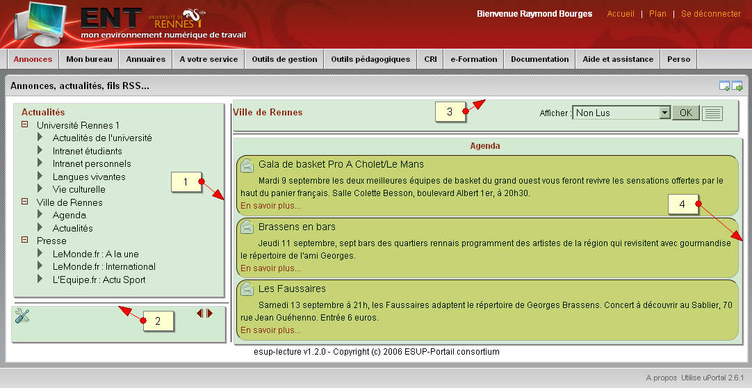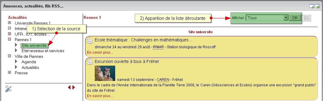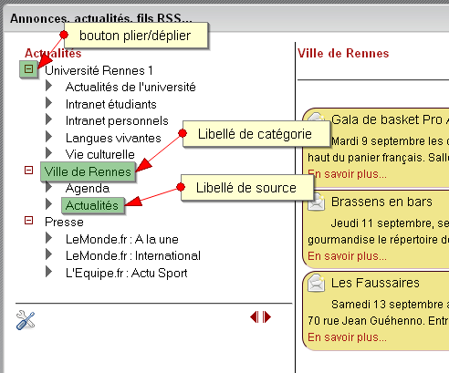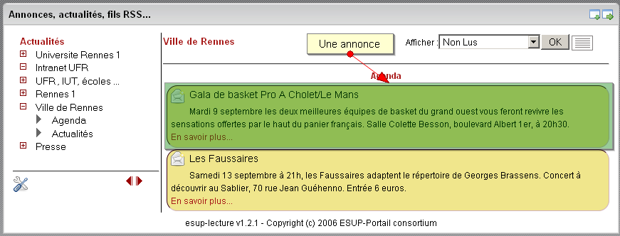 Les annonces proviennent de sources d'informations différentes. Par exemple, les informations concernant l'environnement diffusées par le journal Le Monde ou un thème d'annonces géré par le portlet news ESUP-Portail.
