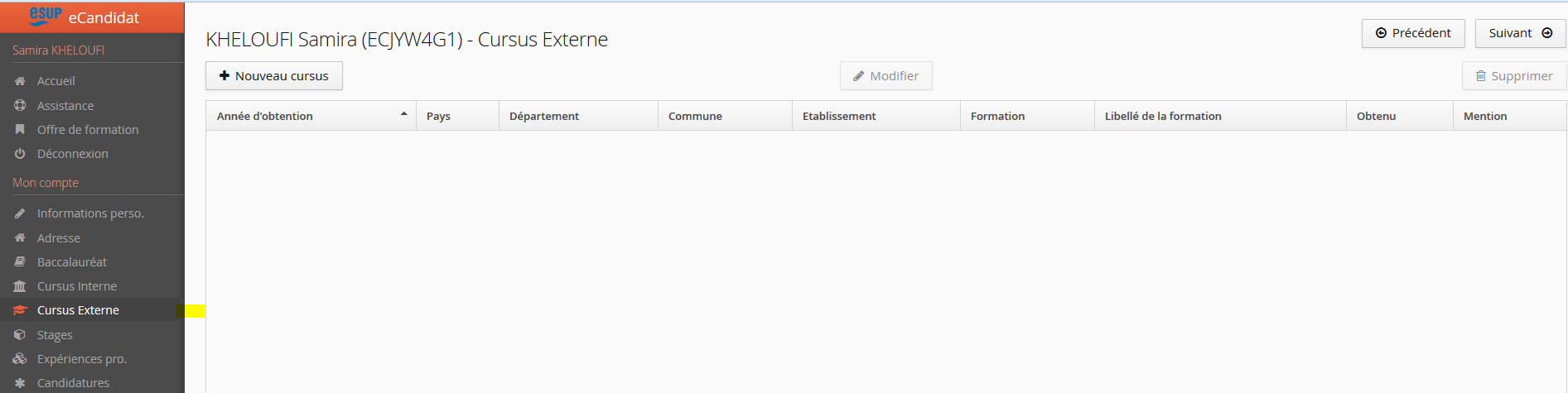 • Accès via la rubrique "Mon compte", menu "Cursus Externe"