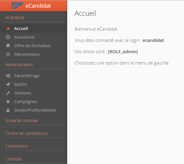 Un centre de candidature est une entité regroupant des commissions. Cela peut correspondre à une composante, un groupement de composantes, un groupement de formations (formations en e-learning par exemple) ou tout autre combinaison au choix de l'établissement. Ce domaine permet de définir les commissions, d'y associer une ou plusieurs formations définies également à ce niveau (choix en particulier du calendrier de candidature), de définir des pièces justificatives partagées entre les formations du centre de candidature et non visibles des autres centres de candidature, d'ajouter des formulaires complémentaires (via l'outil limeSurvey) et de traiter les candidatures à une commission (saisie de l'état du dossier, des pièces justificatives, du type de traitement, de la décision, etc.). Les décisions saisies ne sont pas immédiatement visibles des candidats, celles-ci doivent être validées pour être visibles. Il peut effectuer des extractions de listes (export) en déterminant éventuellement les données qu’il souhaite y voir figurer.