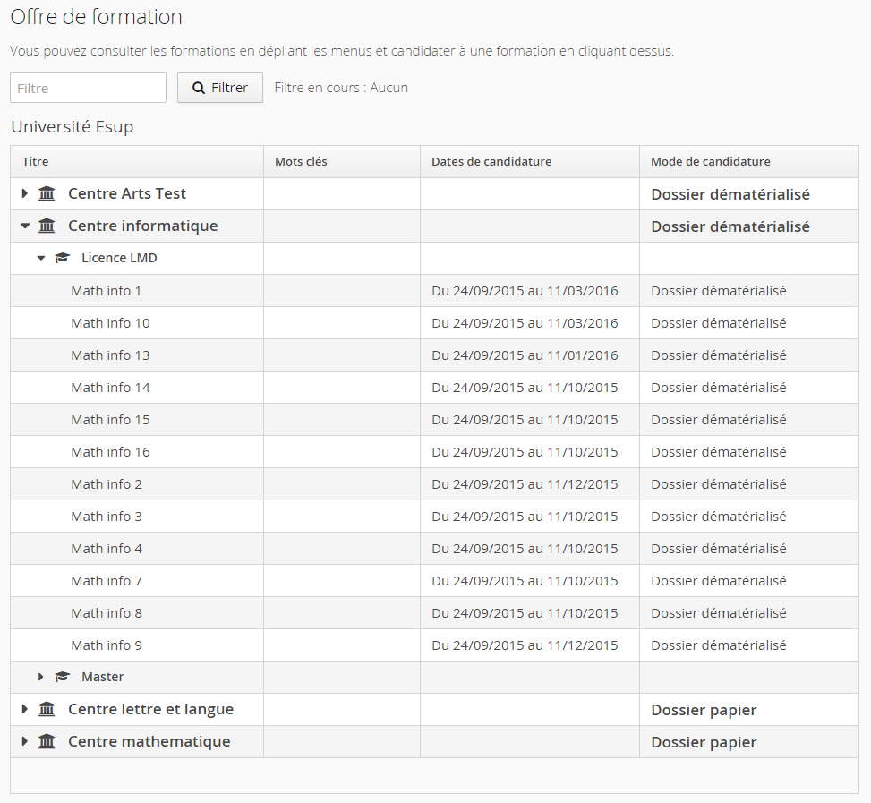 La création d'un compte s'effectue en saisissant 3 informations : un nom, un prénom et une adresse email. Un lien de validation est alors envoyé à l'adresse afin de valider l'adresse et créer le compte. Le candidat renseigne alors ses informations personnelles (obligatoire), son baccalauréat (obligatoire), son cursus externe, ses stages (facultatif) et ses expériences professionnelles (facultatif). Si le candidat est en cours de scolarité, une authentification CAS lui est proposée permettant de rapatrier les données du SI et renseigner le menu "Cursus interne". Une fois les écrans obligatoires renseignés, il peut choisir de candidater sur une ou plusieurs formations parmi celles proposées. Les formations sont présentées par centre de candidature et type de diplôme. Un moteur de recherche en texte libre est également proposé :