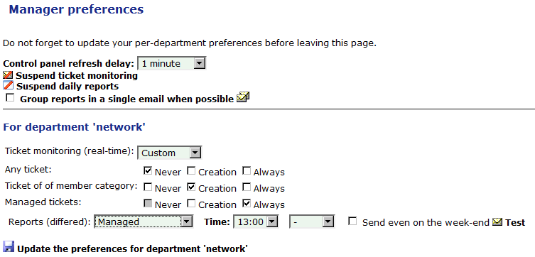 Managers can, for each department, set the way they monitor tickets. Predefined policies are proposed: