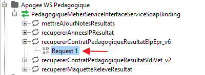 - Le projet est créé avec des requêtes d'exemple pour chaque méthode du service. Modifier la requête automatiquement créée pour recupererContratPedagogiqueResultatElpEpr en double-cliquant sur cette dernière
