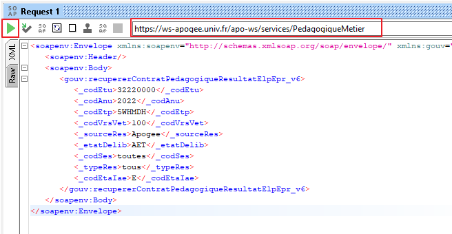 - L'enveloppe SOAP de la requête s'affiche. Il suffit de renseigner les paramètres dans le XML à la place de chaque "?", de vérifier que l'url du service est correcte et de cliquer sur l’icône verte "submit" pour exécuter la requête