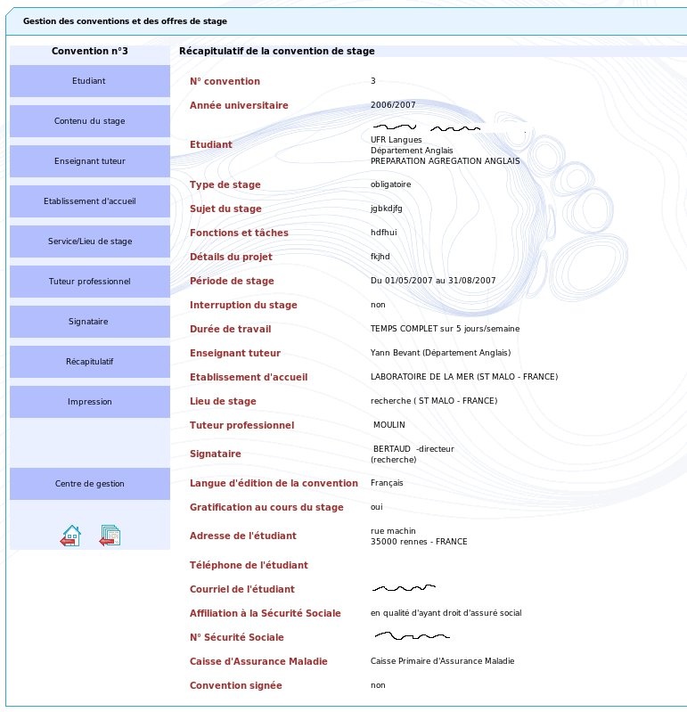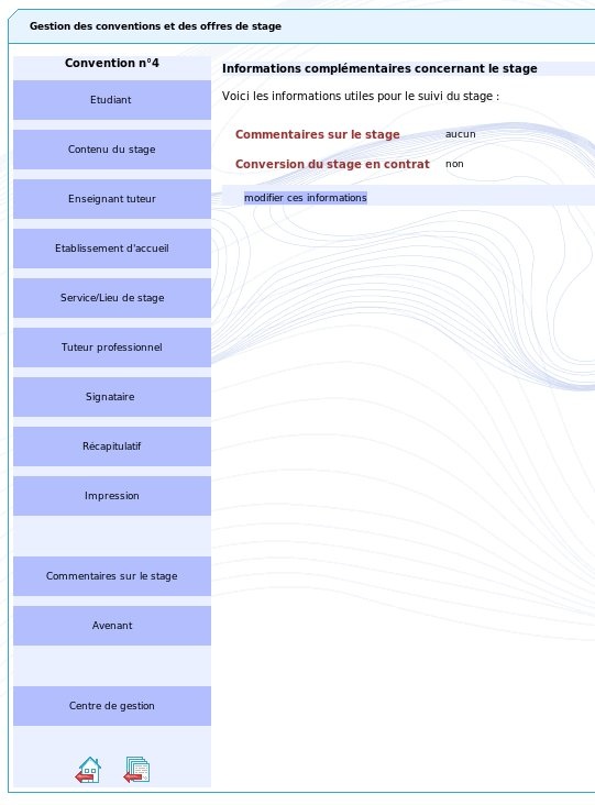 Les informations contenues dans chacun des modules de la convention de stage (étudiant,contenu du stage, choix de l'enseignant tuteur, établissement d'accueil ) peuvent être modifiées ou complétées en cliquant sur l'item de menu de gauche correspondant aux informations à modifier.