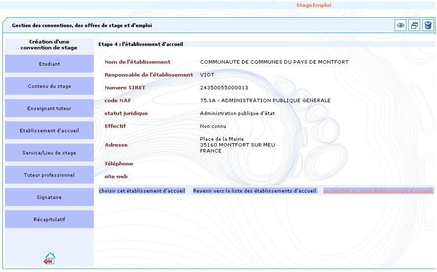 Si le service d'accueil de votre stage est présent dans la liste, cliquez sur "choisir ce service". Une page s'affiche, permettant de confirmer ce choix si celui-ci est correct.