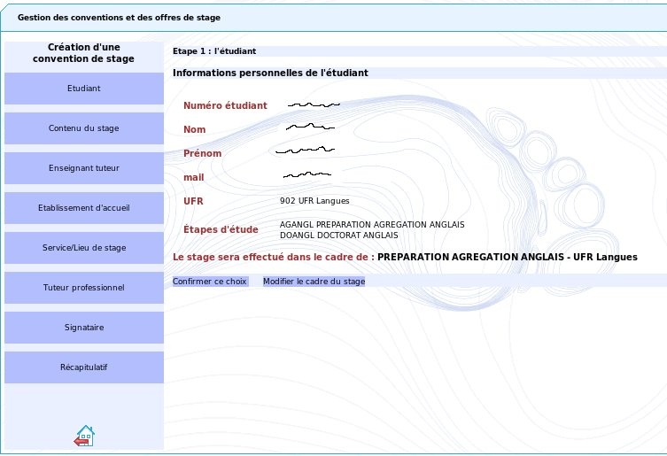 Après avoir cliqué sur "Créer la nouvelle convention", un nouvel écran s'affiche, qui permet de choisir le cadre de votre stage, en particulier si vous êtes inscrit à plusieurs étapes d'étude/ UFR (dans cet exemple les numéro d'étudiant, nom et prénom ont été occultés) :