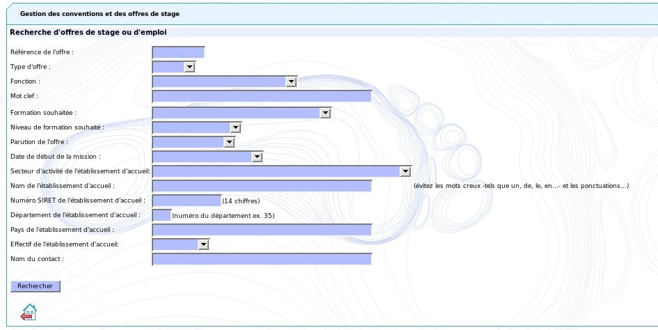 Cliquez sur "rechercher ou saisir une offre" dans le menu principal. Un formulaire de recherche permet de choisir parmi les critères de recherche. Dans le cas où aucun critère de recherche n'a été saisi, le résultat de la recherche sera l'ensemble des offres du ou des centres de gestion dont vous faites partie (en fonction de votre ou vos étapes d'étude ou UFR)..