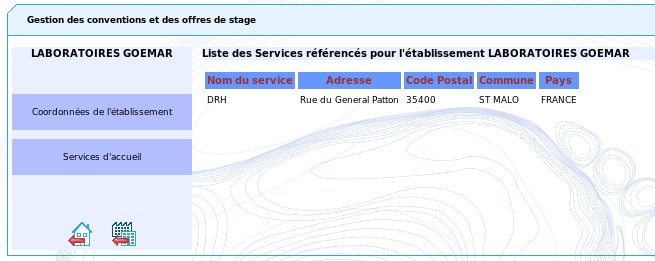 Vous pouvez utiliser la barre de menu à gauche afin de visualiser les différents services de cet établissement qui accueillent des stagiaires (cliquez sur Services d'accueil) :