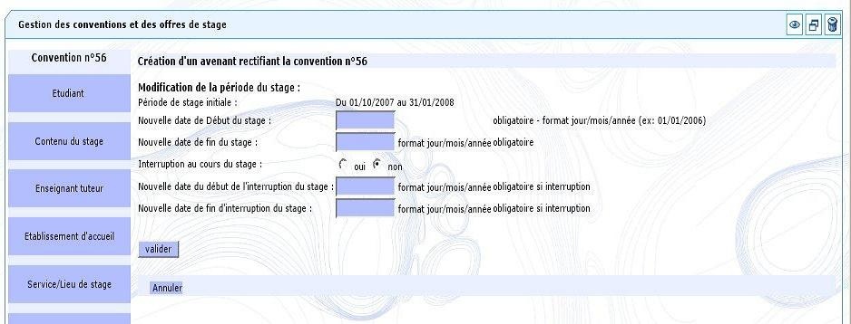 Dans cet exemple il s'agit d'une modification des dates de stage , indiquez les nouvelles dates (sous le format jour/mois/année) puis cliquez sur "valider"
