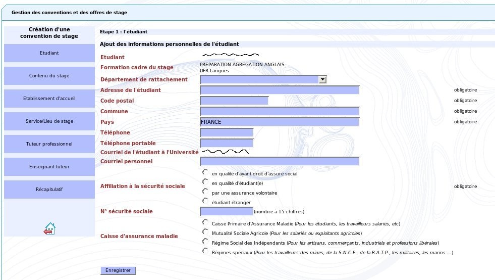 Lorsque vous aurez confirmé le cadre de votre stage, ou si vous n'êtes inscrit qu'à une seule étape d'étude, le formulaire ci dessous s'affiche :
