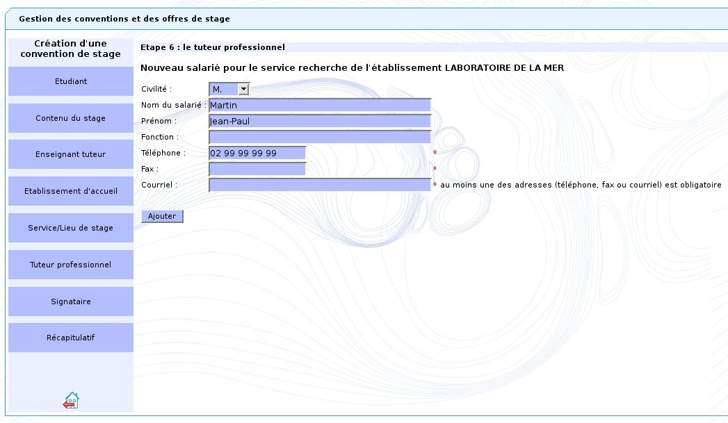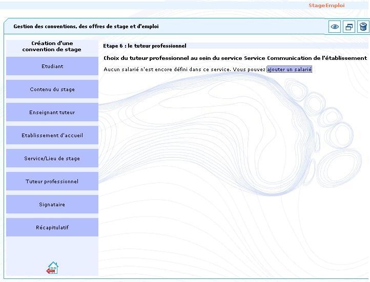 - Ajouter un établissement ainsi que les services d'accueil et les tuteurs professionnels pour le suivi des stages