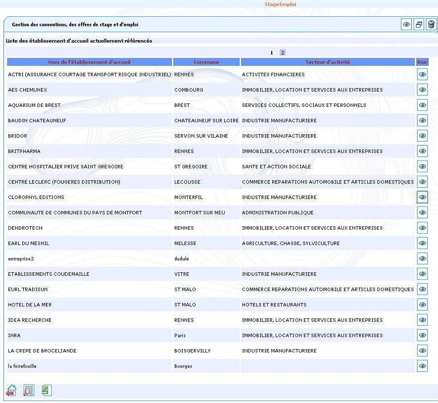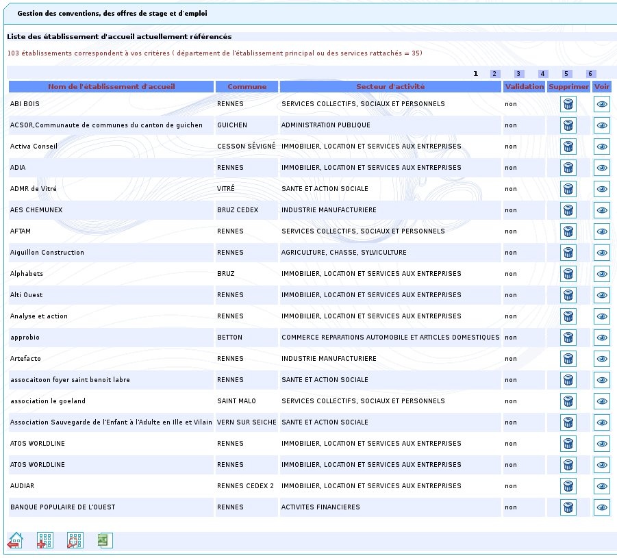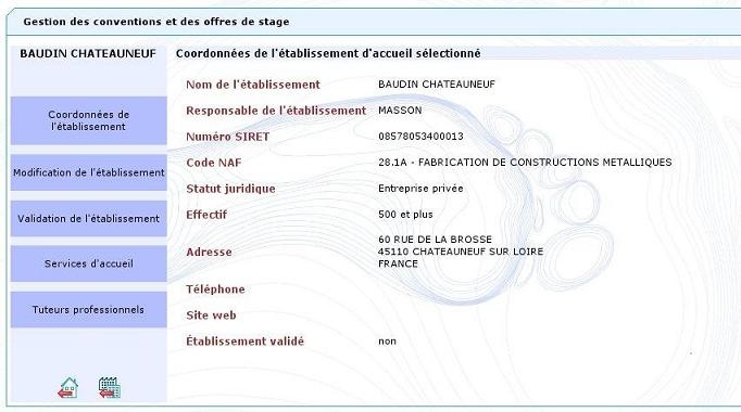 La base des établisements est mise à jour soit par les étudiants lors de la saisie d'une convention de stage soit par les personnels gestionnaire dans un centre de gestion .